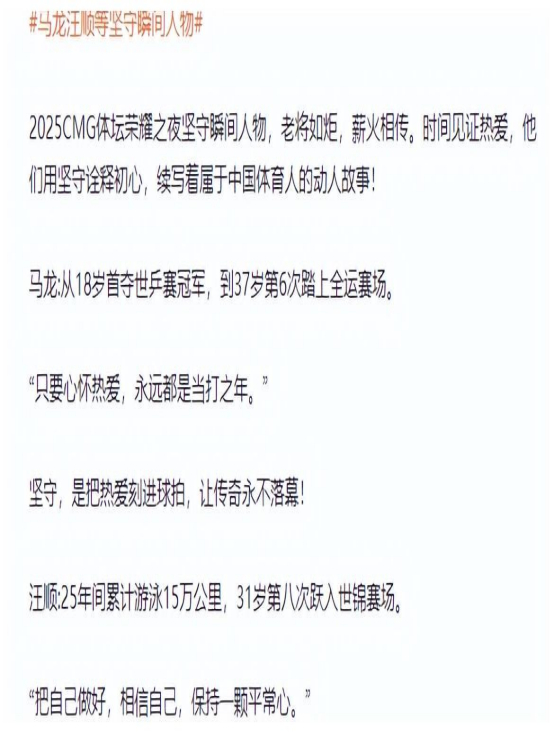 部分参考资料:澎湃新闻|马龙说对乒乓球的热爱如初 20251120咪咕体育|群星闪耀!马龙徐梦桃等当选坚守瞬间人物 杨瀚森入围突破瞬间人物 20260105
