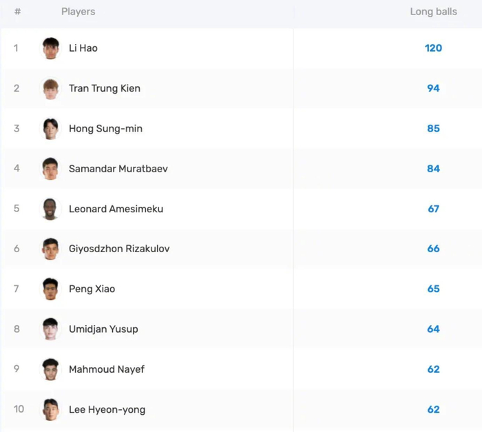 #u23国足决赛将对阵日本# 本届U23亚洲杯长传数据榜单更新,中国U23球员李昊以120次长传高居榜首,成为目前赛事长传输出最稳定的球员。
