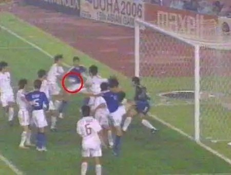 第65分钟,日本队角球开出,中田浩二在禁区内非常明显地用右手将球碰入球门,然而当值裁判视而不见,认定进球有效!赛后,中田浩二的一句 “这是运气球”,更是引起巨大争议。