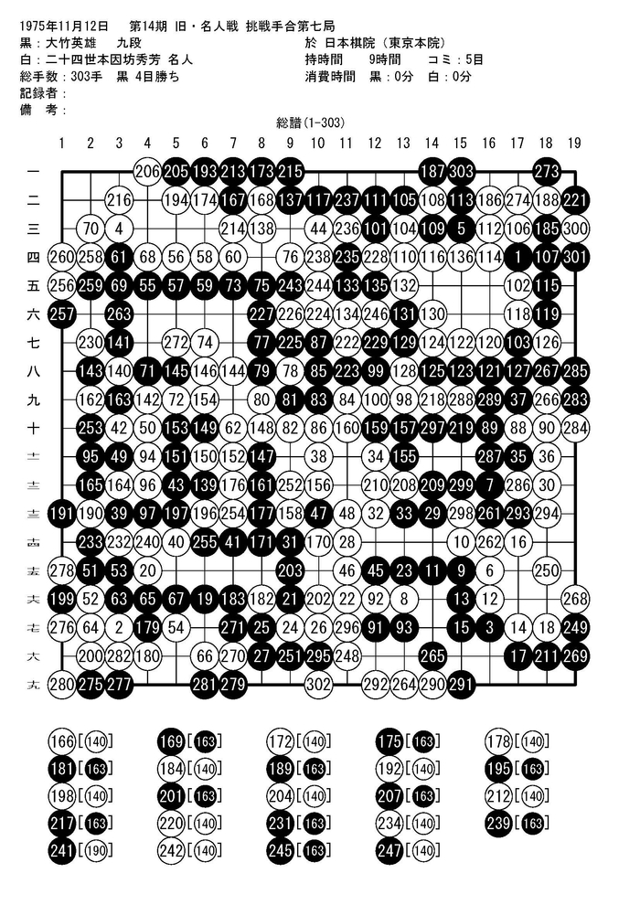 鏖战拖到第7局,大竹英雄执黑。白102和白106的碰开始,局面开始剧烈动荡。白106如果先在108位扳出,然后按黑109位、白110位、黑111位、白112位的进程更佳。接着若走到黑114位、白106位、黑113位、白107位,白棋大有可为。黑139是攻击白棋大龙的要点。此后左边的劫争持续良久,白228或许是败着。如果白棋先在229位切断,黑246位、白238位后胜负仍难断定。