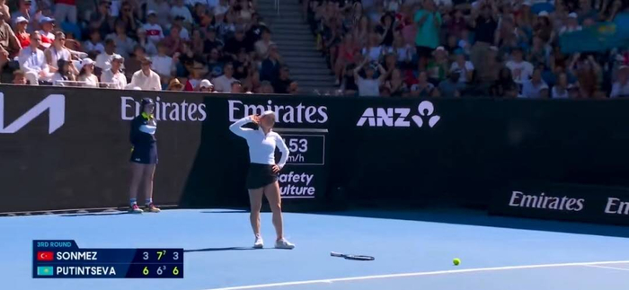 普丁塞娃与土耳其球员森梅兹的这场比赛从一开始就充满火药味。比赛过程中,明显支持本土球员的土耳其球迷不断用嘘声和咳嗽声干扰普丁塞娃。这惹怒了向来脾气火爆的哈萨克斯坦姑娘,她在最后一分结束后,情绪直接爆发了。