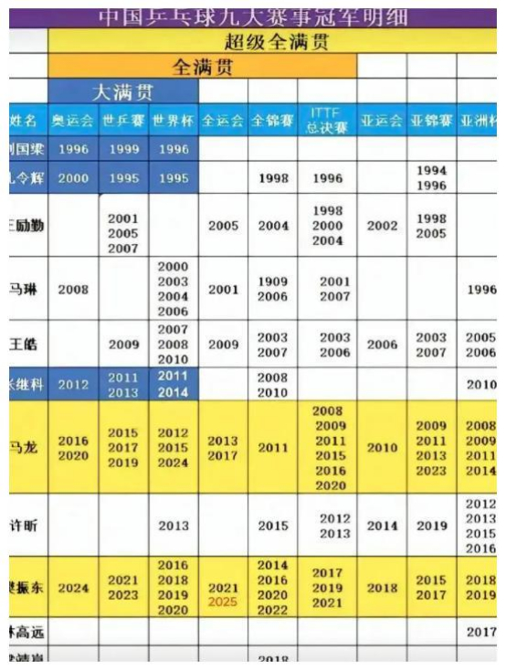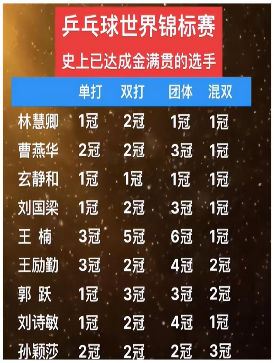 若论三大赛的单打成绩,国乒的大满贯阵容还有刘国梁、张怡宁等人。