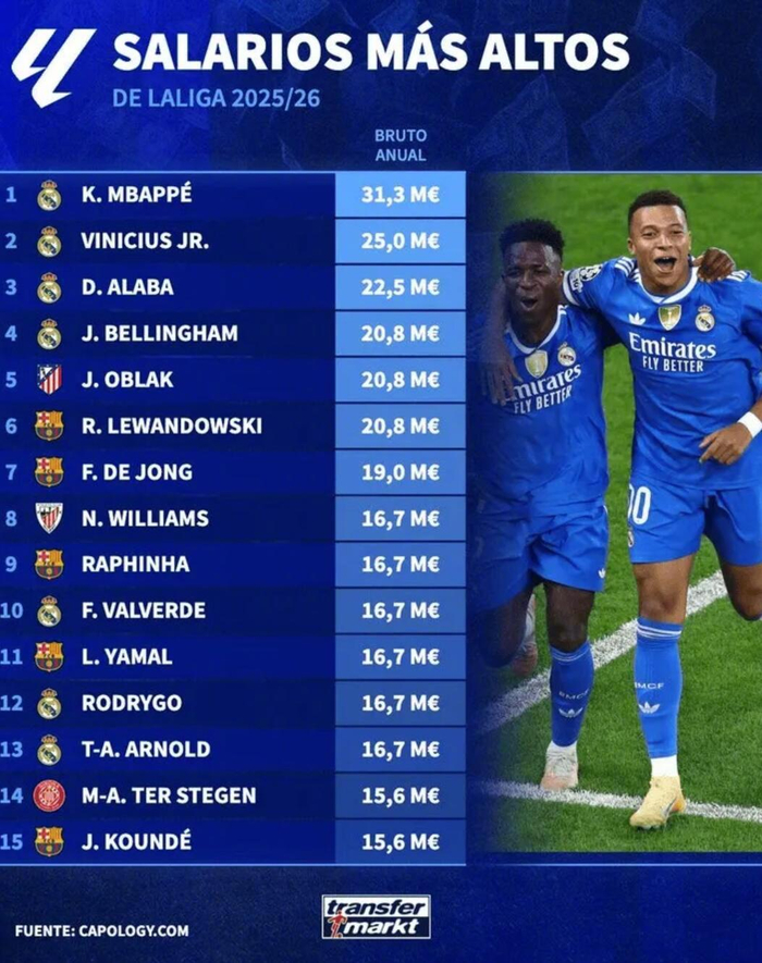 西甲年薪榜前四均属皇马,姆巴佩3130万欧居首