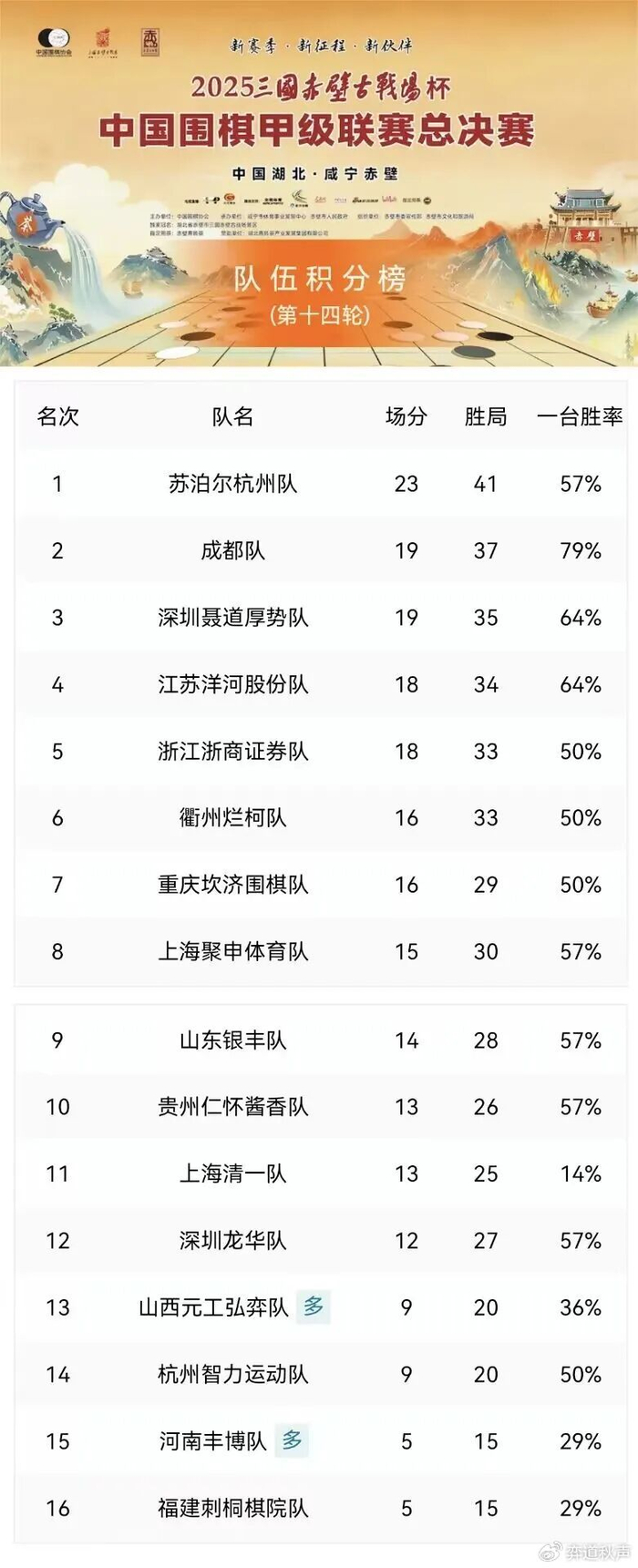 2025中国围甲联赛最后两轮于今年1月在湖北赤壁以赛会制进行,十六支队伍将排定最终座次。