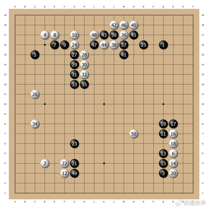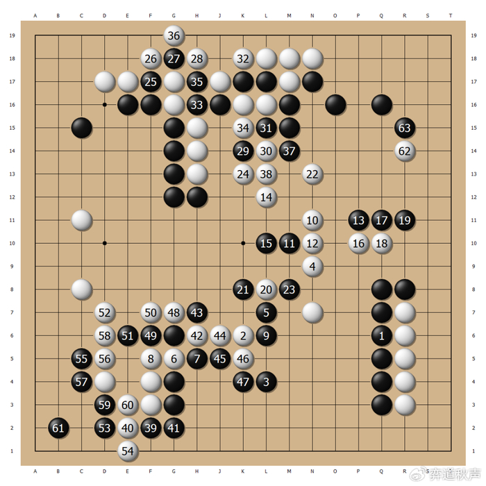 白40、42的应对略显委屈,黑棋先手利用后,抢到下边黑49的挡,楷文打开了局面。