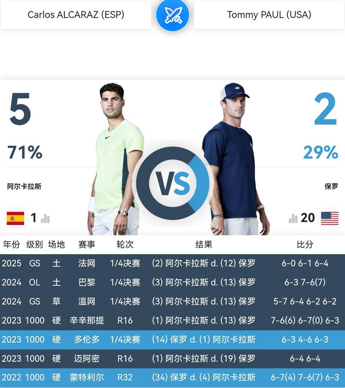 职业生涯至今,阿尔卡拉斯和保罗交锋七次,五胜二负,其中自2023年辛辛那提大师赛1/8决赛三盘获胜起,取得一波对阵保罗的跨越三个赛季的四连胜。诚如阿尔卡拉斯自己所言的“每次和他比赛都很艰难”,2024年温网1/4决赛,阿尔卡拉斯就是在第一盘5:7告负之后,才连胜三盘逆转过关的。