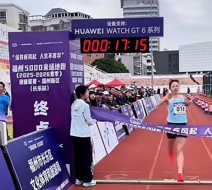 这是在福州长乐举行一项俱乐部赛事,去年一共四站比赛,张水华选择参加第一站,5000米对她来说很轻松,相当于有氧跑,结果在女子选手里面第一个冲线,成绩是17分12秒。