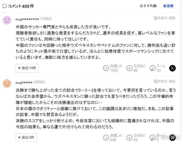 还有一个日本网友指出董路自相矛盾逻辑混乱:“一路打进决赛的所有比赛都在用5-3-2阵型,现在又在这里说些什么。要吐槽的话,从大赛初期赢乌兹别克斯坦的那场就该说了吧。明明正是这套防守阵型发挥作用,球队才闯进的决赛……明明是输给了日本球员的个人能力和团队配合,却抛出这样的论调,实在太过幼稚。”