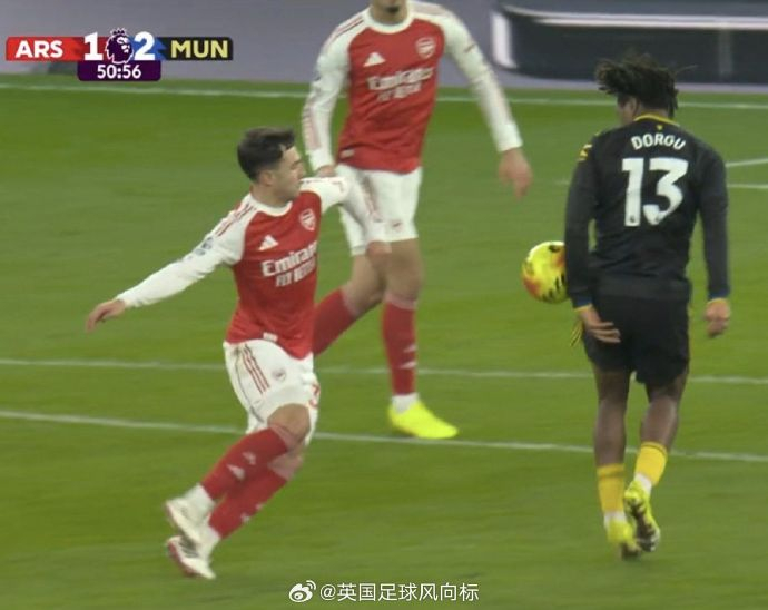 【#英超争议判罚#:多尔古进球前手球?】#阿森纳2比3曼联#,比赛其中一个争议点,就是多尔古下半时抽进世界波之前,是否有手球犯规?这个问题在英国那边有很大的争议,双方的观点如下: