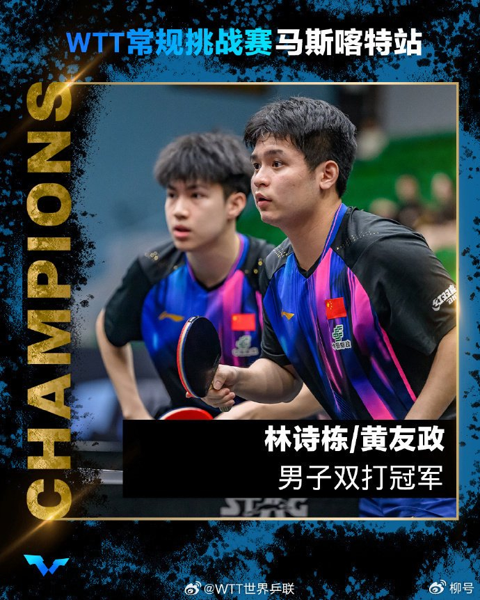 北京时间1月26日消息,2026年WTT常规挑战赛马斯喀特站落下帷幕,中国男乒夺得2个冠军。男子单打决赛中,小将温瑞博以4-3绝杀德国名将弗朗西斯卡。男子双打决赛中,林诗栋/黄友政组合以3-1战胜德国组合3-1杜达/弗朗西斯卡。