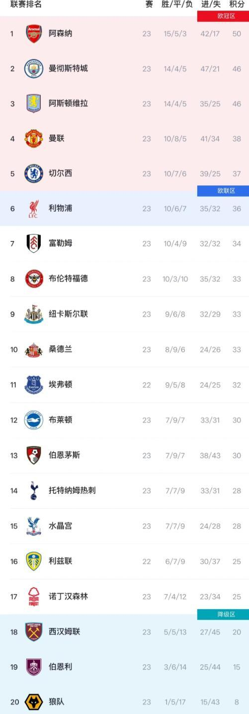 英超第23轮的比赛中,阿森纳主场以2-3不敌曼联,虽然以50分排在榜首,但领先优势被进一步缩小。曼联凭借这场胜利重新进入欧冠区,积分升至 38分,排名第四。