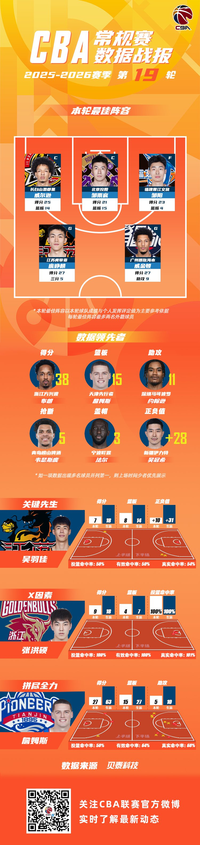 CBA常规赛第19轮最佳阵容出炉,布朗38分领跑得分榜