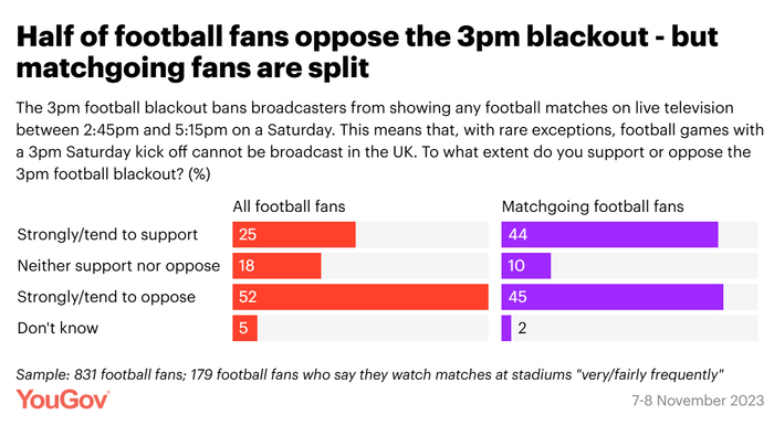 球迷间也存在较大的分歧。2023年,YouGov就曾关于这一禁播条例做过民意调查,其中,52%的球迷反对下午3点的禁播令,只有四分之一的人表示支持。但经常现场观赛的观众意见更为两极化——45%反对禁播令,44%表示支持。