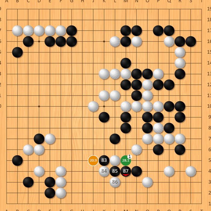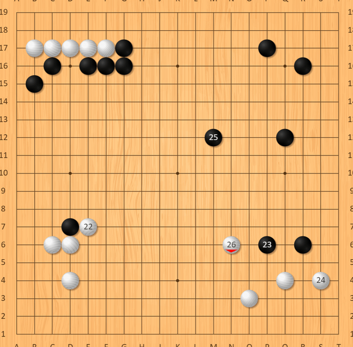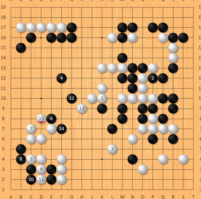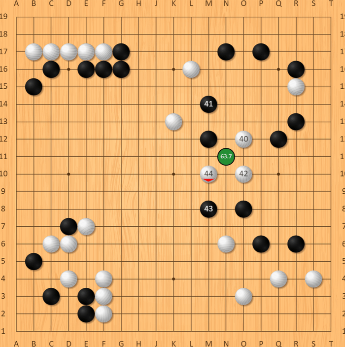实战中丁浩执黑先行,采用错小目开局,稳健扎实。前40余手双方平稳瓜分角部实地,局势胶着。随后右上角落成为攻防主战场,白棋主动打入,试图搜刮实地、破坏黑棋势力范围,丁浩则果断展开包围,与对手展开激烈对杀。