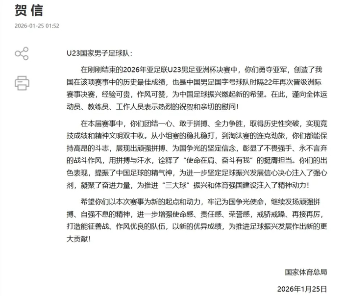 此外,在中国队输球仅一小时后,体育总局和中国足协也在凌晨2点发来祝贺!一是鼓励刚刚完败的中国队小伙子,二是肯定他们在U23亚洲杯上创造的成绩。