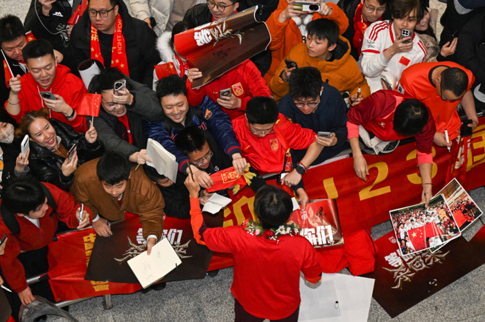 尽管旅途疲劳,但是球员们还是满足了很多球迷签名、合影的愿望。来自西安的小球迷刘禹泽年仅10岁,他因为在得知球队3比0战胜越南队后激动落泪而受到大家关注。能够来到现场迎接队伍,他开心地说,中国队队员就是他心中的英雄,希望球场上的大哥哥们越来越好。他最喜欢的队员是前锋拜合拉木,当他与高大的拜合拉木合影时,笑容绽放在他的脸上。拜合拉木说:“有很多球迷朋友接机,非常开心,谢谢大家!希望以后的比赛,拿个冠军回来!”