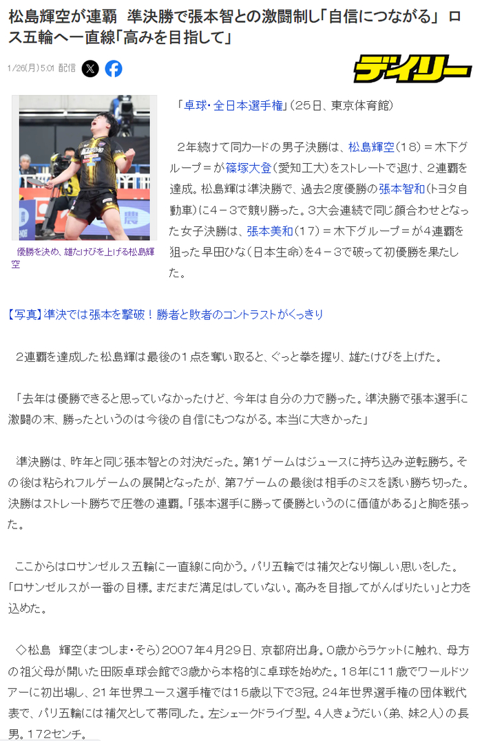 北京时间1月26日,日媒专访了18岁松岛辉空,松岛在采访中这样说道:去年我没有想过能多管,但今年我是靠自己的力量获胜的,半决赛再度击败张本智和选手后我获得了巨大的自信,尤其是决胜局引导他失误而取胜,我觉得战胜张本选手获得冠军很有价值。