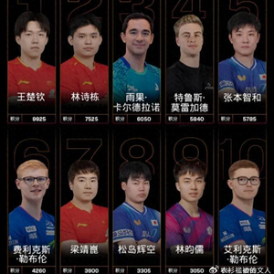 第八名,松岛辉空,积分为3305分;第九名,林昀儒,积分为3050分;第十名,艾利克斯-勒布伦,积分为2710分。其他国乒球员的排名是这样的:向鹏,排名第12位;周启豪,排名第23位;温瑞博,排名第24位;陈垣宇,排名第28位;陈俊菘,排名第38位;黄友政,排名第43位;薛飞,排名第46位。值得一提的是,在本周排名中,温瑞博上升了7个名次,刷新职业生涯最高排名。