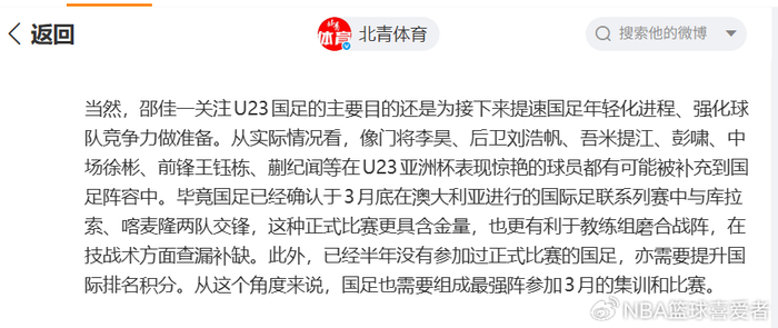 据《北青体育》的透露,由于国足将在3月份远赴澳大利亚参加热身赛,对手分别是澳大利亚队、喀麦隆队以及库拉索队。邵佳一决定从这批U23国足中,选拔出一批表现出色的年轻球员,补充到国家队中。