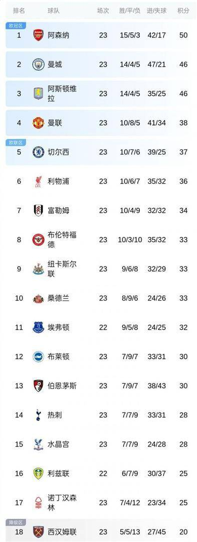 而赢球的曼联,凭借这宝贵的3分,积分从35分涨到了38分。 与此同时,原本排名在他们之前的切尔西和利物浦在本轮非平即负。 此消彼长之下,曼联的联赛排名从赛前的第五位,一跃升至第四位,进入了欧冠资格区。 他们反超了切尔西和利物浦,重新将争夺下赛季欧冠门票的主动权握在了自己手里。 当然,联赛还有很长的路要走,热刺、纽卡斯尔等球队也虎视眈眈,前四的争夺依然会非常激烈。