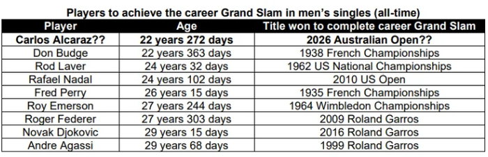换句话说,阿尔卡拉斯只要再拿下澳网冠军,就能完成 “职业生涯全满贯”,就算放眼整个公开年代,这项成就也仅为极少数顶尖选手所专属。数据足以说明一切:公开赛时代仅有 5 位球员达成这一成就,分别是罗德・拉沃尔、阿加西、费德勒、纳达尔和德约科维奇。