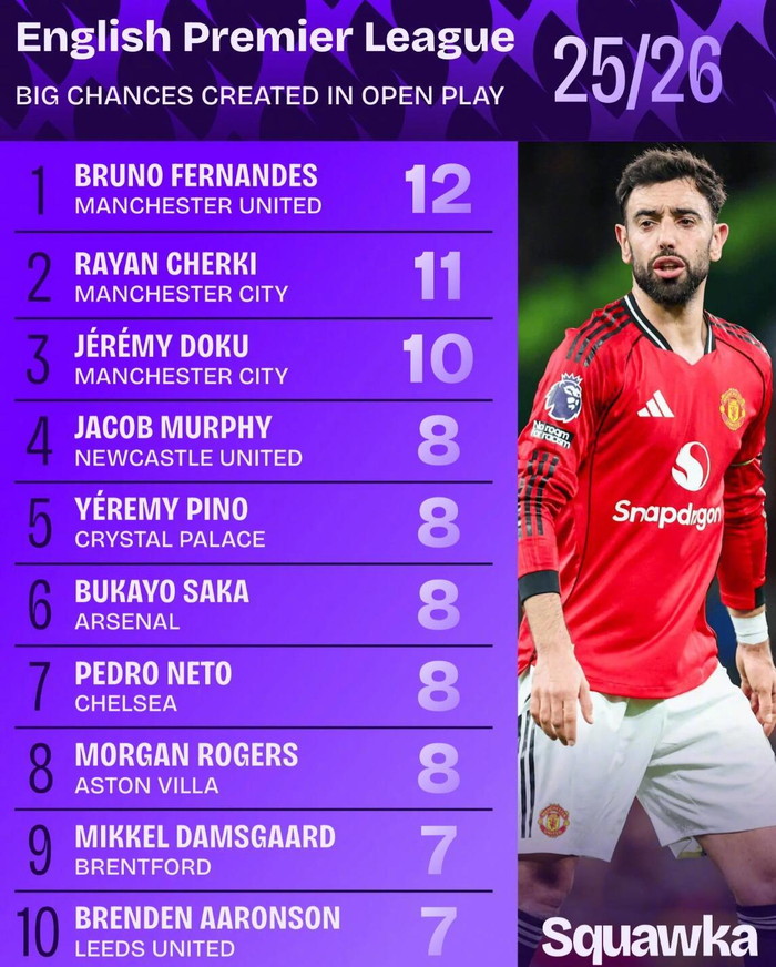 曼联B费英超运动战创造重大机会最多,曼城双星紧随其后 虎扑足球 虎扑足球官方账号 01.2813:45 关注 据著名统计机构Squawka的数据显示,曼联中场布鲁诺-费尔南德斯是本赛季英超运动战中创造重大机会最多的球员,曼城双星切尔基和多库紧随其后。
