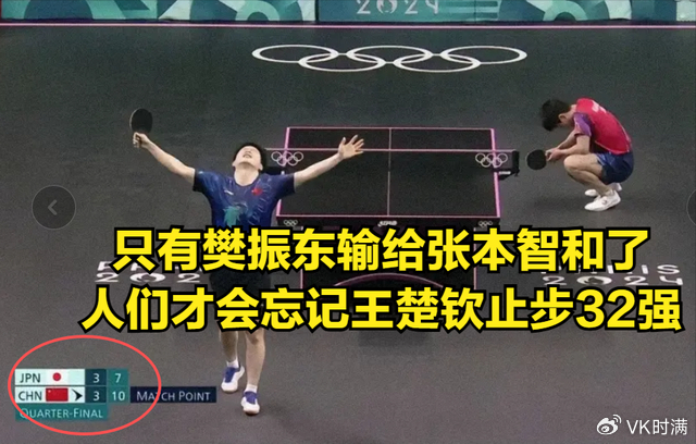 ‘为什么2024年巴黎奥运会的男单1/4决赛,王楚钦会在观众席上笑,会笑着跟旁边人说,樊振东也要输了。因为只有樊振东输给张本智和了,人们才会忘记王楚钦止步32强这个事情,转而说起樊振东为什么输给张本智和,止步8强这个事。