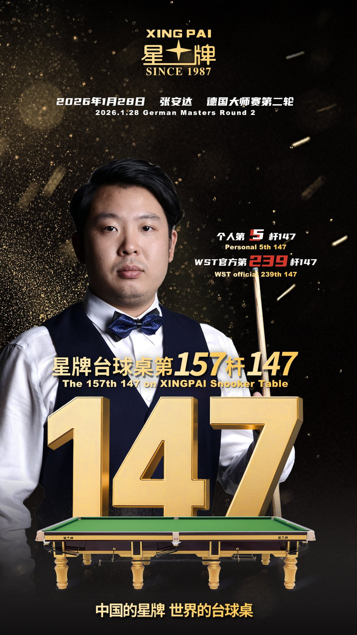 星牌新年第一杆147!德国大师赛张安达打出满分杆 星牌第157杆