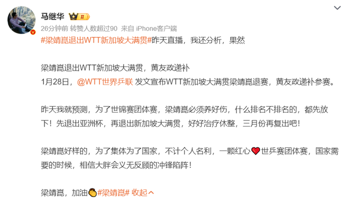 马继华写道:我昨天就预测过,为了世乒赛团体赛梁靖崑必须养好伤,什么世界排名都不重要,先退亚洲杯再退新加坡大满贯,好好治疗休整,三月份再复出吧。
