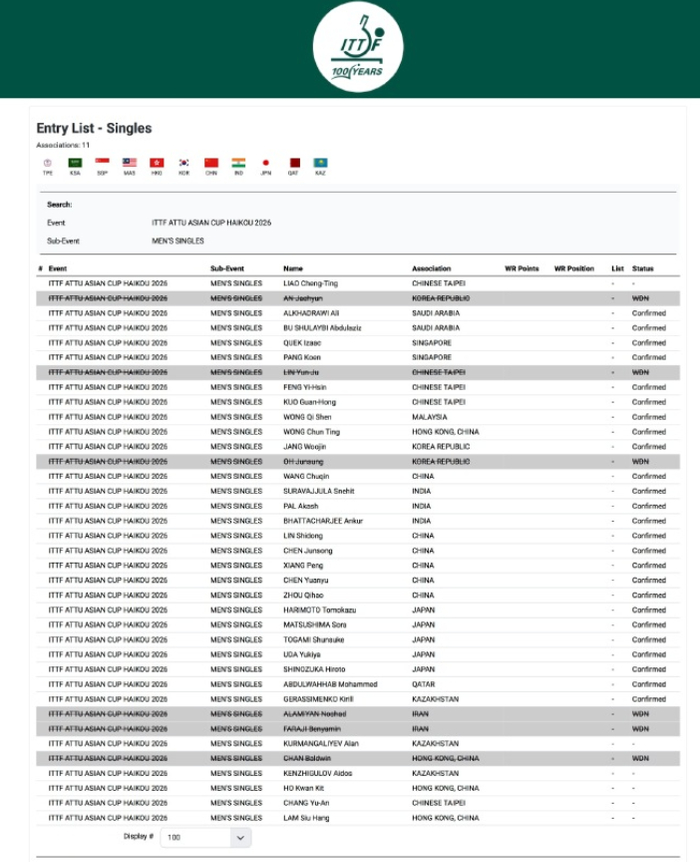 两天之前,根据ITTF官方中国队参与亚洲杯的名单来看,29岁的梁靖崑也已经退出,20岁的小将陈俊菘则已经进入亚洲杯名单。(2月4日-6日)