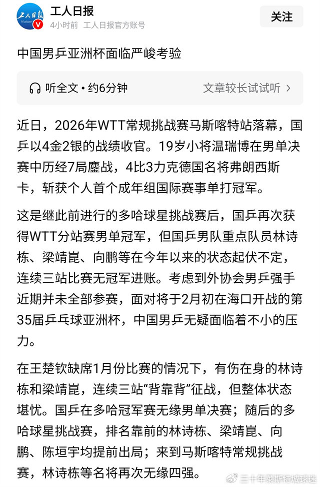 该媒体更是指出:“考虑到外协会男乒强手近期并未全部参赛,面对将于2月初在海口开战的第35届乒乓球亚洲杯,中国男乒无疑面临着不小的压力。”