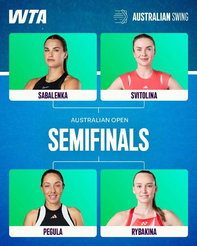 1月28日,随着佩古拉淘汰阿尼西莫娃之后,2026澳网正赛女单1/4决赛结束,四强席位全部产生,萨巴伦卡、斯维托丽娜、莱巴金娜、佩古拉会师半决赛,两场对决将在1月29日展开,产生决赛对阵的双方。