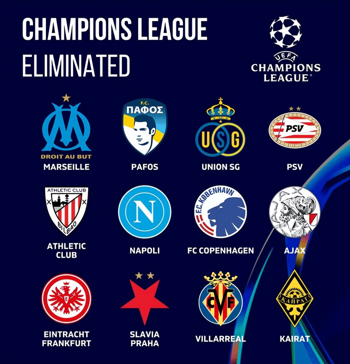 此外,还有12支球队位列积分榜前24名之外被淘汰出局,退出了本赛季欧冠的争夺。