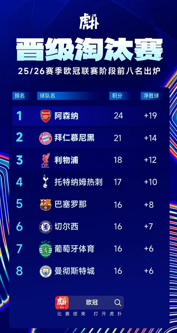 最终,阿森纳、拜仁慕尼黑、利物浦、热刺、巴塞罗那、切尔西、葡萄牙体育、曼城获得了前八名,直接晋级16强。