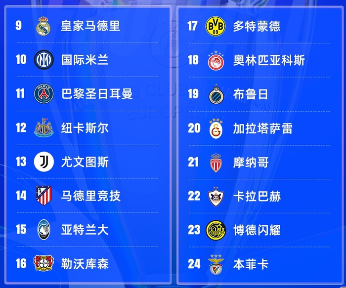 附加赛区包括了皇马、国米、巴黎、纽卡、尤文、马竞、亚特兰大、勒沃库森这八支实力不俗种子球队,及多特蒙德、奥林匹亚科斯、布鲁日、加拉塔萨雷、摩纳哥、卡拉巴赫、博德闪耀、本菲卡这八支不是种子却实力也很好的球队。接下来会靠专门给到的抽签来决定对阵顺序,胜者晋级淘汰赛,输了的就跟本赛季拜拜了。
