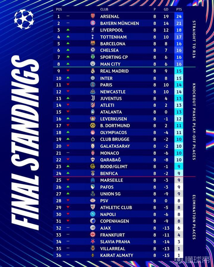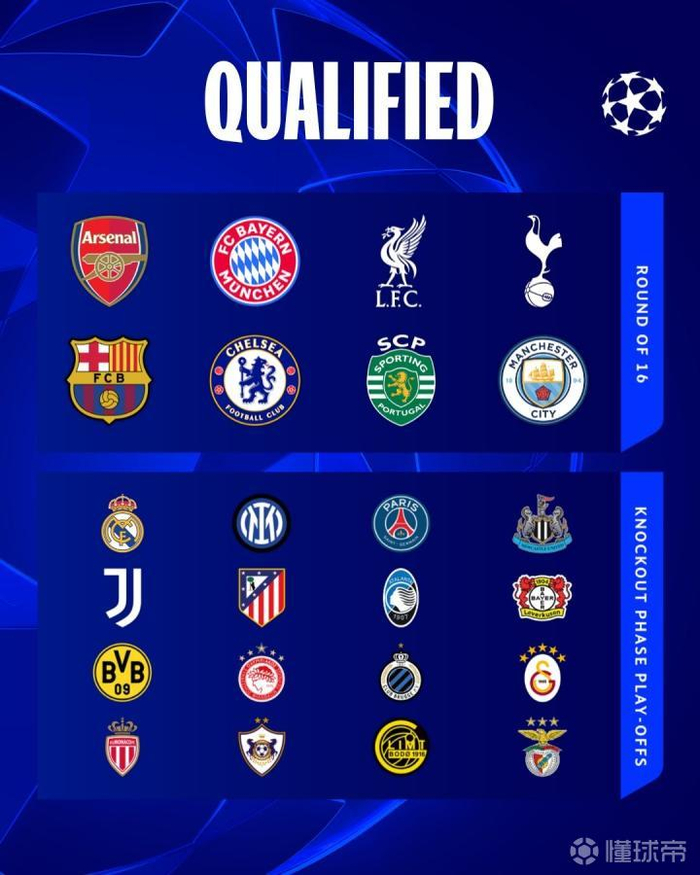 2025-26赛季欧冠联赛阶段比赛战罢,英超6队参赛5队直通十六强,西甲5队参赛仅巴萨直通,意甲法甲没有球队直通十六强,意甲三队进入附加赛。