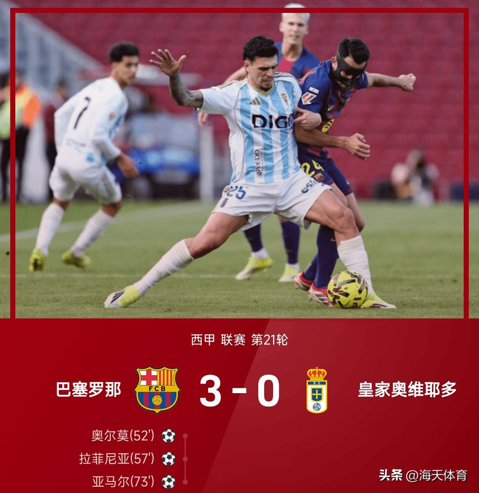 25/26赛季西甲联赛第21轮,巴塞罗那主场对阵皇家奥维耶多。上半场,双方均未破门。易边再战,奥尔莫抽射破门助巴塞罗那打破僵局,拉菲尼亚单刀挑射再入一球,亚马尔接应奥尔莫传中凌空侧勾破门。全场比赛结束,巴塞罗那3-0皇家奥维耶多,夺回积分榜榜首位置。
