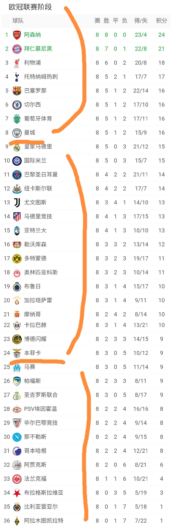 可以看到8支直通欧冠16强的球队有5支英超的球队,分别是阿森纳、利物浦、热刺、切尔西、曼城。可以看到英超真是独领风骚啊。而在直通榜单中没有意甲和法甲的球队,仅1支西甲的球队,1支德甲的球队,1支葡超的球队。