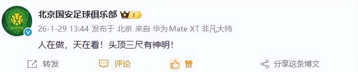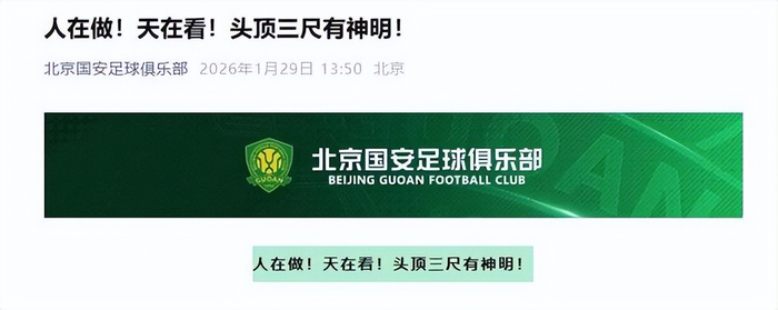 而在扣分后,申花、津门虎、海港等俱乐部第一时间主动发文认错道歉,只有北京国安在社媒发文霸气硬刚足协:“人在做,天在看!头顶三尺有神明!”