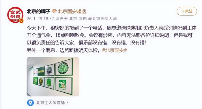 北京时间1月29日,北京国安球迷代表“北京的晖子”在社媒发文称,自己下午接到电话,作为球迷组织负责人,受邀参与了国安俱乐部召开的有关此次扣分事件的会议。