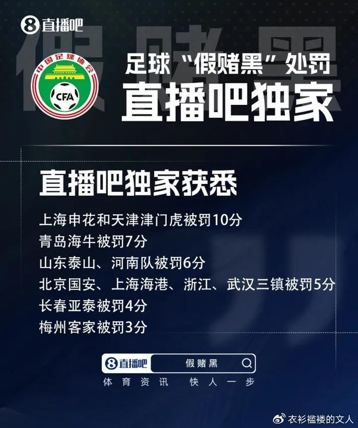 有一说一,这些中国足球的蛀虫被彻底清理出去,实在大快人心,而他们也是罪有应得。不过,相比较第一次会议,这一次的会议又做出了不一样的决策,那就是公布了对职业俱乐部的处罚结果。其中,中超有9队涉案,遭遇了不同程度的处罚。比如天津津门虎足球俱乐部,扣10分并罚款100万元;上海申花足球俱乐部,扣10分并罚款100万元;上海申花足球俱乐部,扣10分并罚款100万元;山东泰山足球俱乐部,扣6分并罚款80万元……