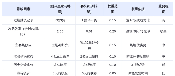 尽管主场两连败,但面对客场虫巴列卡诺,皇马在姆巴佩(近3场5球)和居莱尔(7助攻)带领下有望轻松取胜。对手近4客场0进球的进攻能力难以威胁库尔图瓦,而皇马高达89.5%的传球成功率(联赛第1)将彻底掌控节奏。此役过后,银河战舰或暂时登顶积分榜。