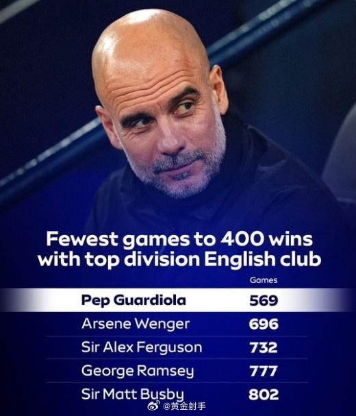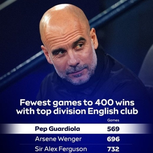瓜迪奥拉以569场成为英格兰顶级联赛在一家俱乐部最快达成400胜主教练,位居他身后的是温格(696场)、弗格森爵士(732场)、乔治·拉姆塞(777场)、巴斯比爵士(802场)。