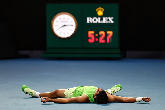 不过第5盘,贵为世界第1的阿尔卡拉斯却在带伤情况下,破掉了兹维列夫的发球胜赛局,在3-5落后的绝境下,连赢4局,最终7-5逆转取胜,总比分3-2淘汰兹维列夫,生涯首次打进澳网男单决赛,距离首座澳网男单冠军和“全满贯”伟业,仅差最后一步。