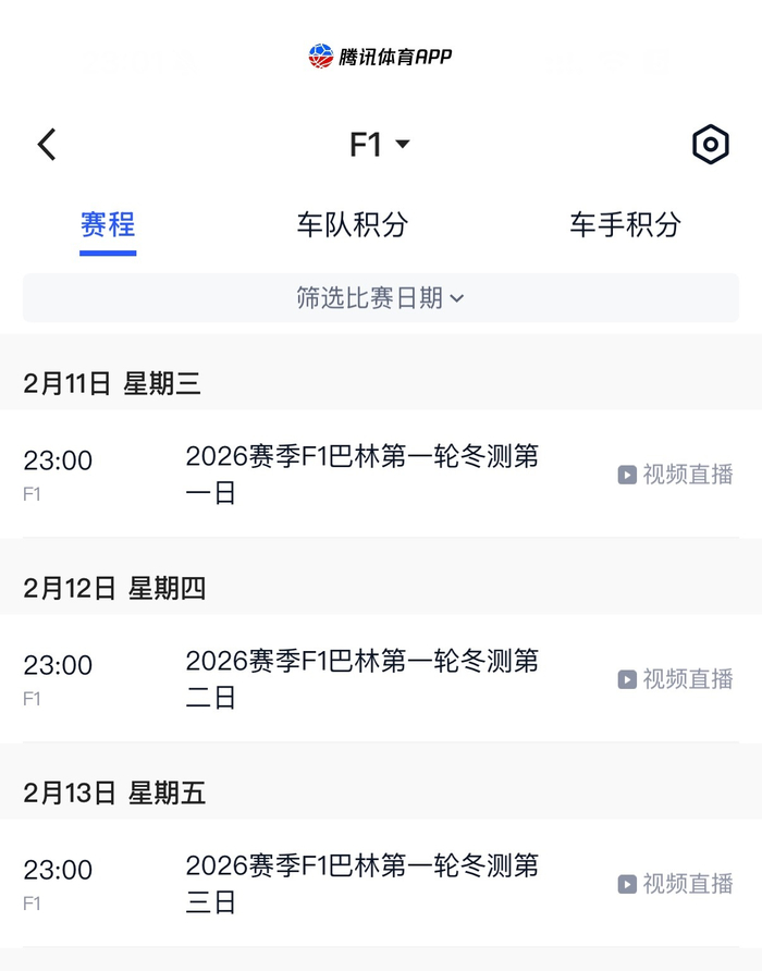 2月11-13日,F1第一轮季前测试,地点位于巴林国际赛道。F1官方从2019年起开始直播季前测试,今年将是腾讯第一次直播季前测试。不过今年的第一轮季前测试按照官方要求只会直播每天的最后一小时(每天的测试分为上下午,各4小时)。