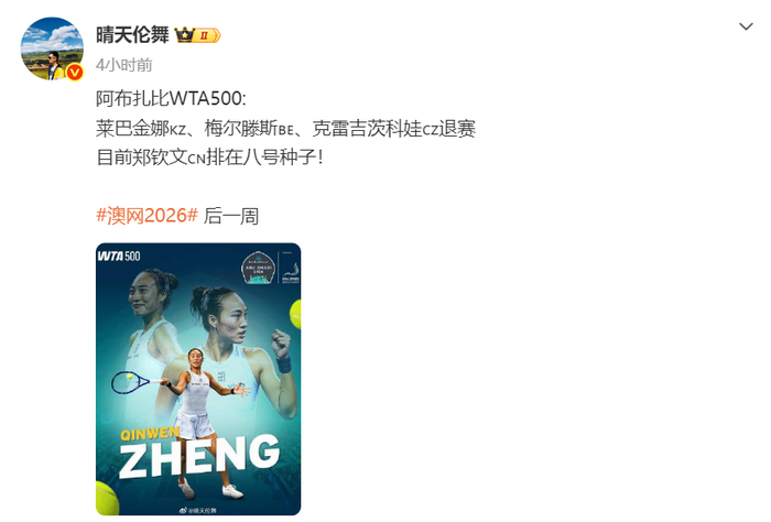 根据最新的消息,莱巴金娜晋级澳网决赛之后,已经决定退出WTA500阿布扎比站,跟她同时退赛的选手,还有姆博科、梅尔滕斯、克雷吉茨科娃,也让郑钦文捡到了大礼。