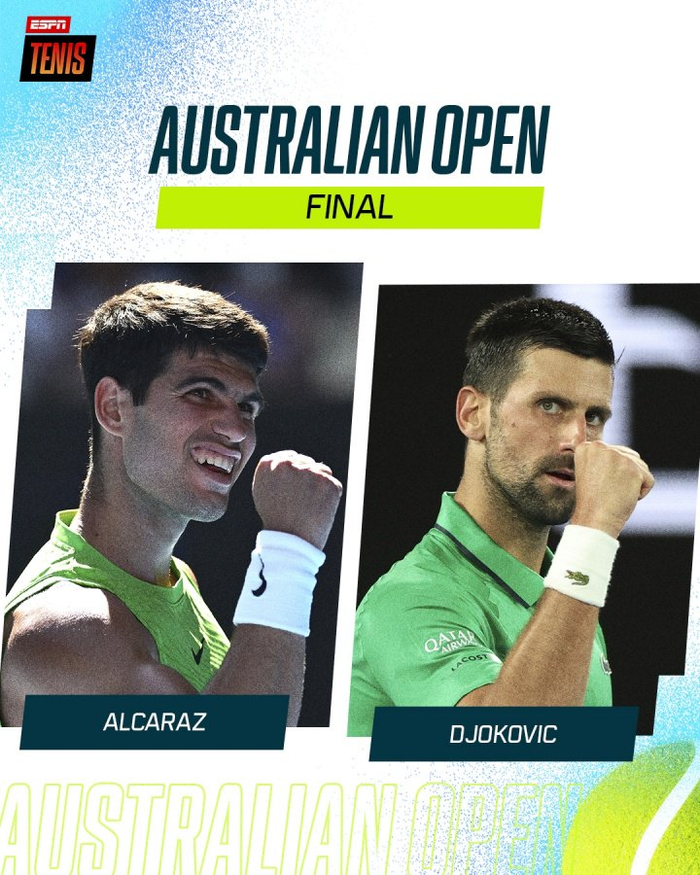 决赛中,德约将再次面对世界排名第1位的阿尔卡拉斯,将于北京时间2月1号本周日下午16:30进行,本场决赛无论谁夺冠都将是历史性时刻,德约将冲击第25个大满贯,阿尔卡拉斯冲击全满贯,目前德约科维奇相互交手战绩5-4占优。