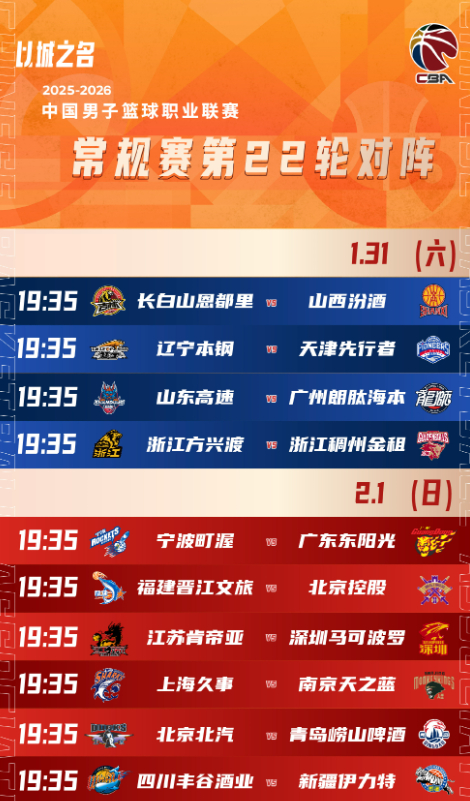 CBA官方分享常规赛第22轮赛程:广厦vs浙江,上海vs南京 启示者手书 01.3110:24 关注 来源: 虎扑01月31日讯 昨日CBA第21轮已全部结束。今日,CBA官方分享常规赛第22轮赛程。今晚将进行四场比赛,其中山西、广厦将出战。