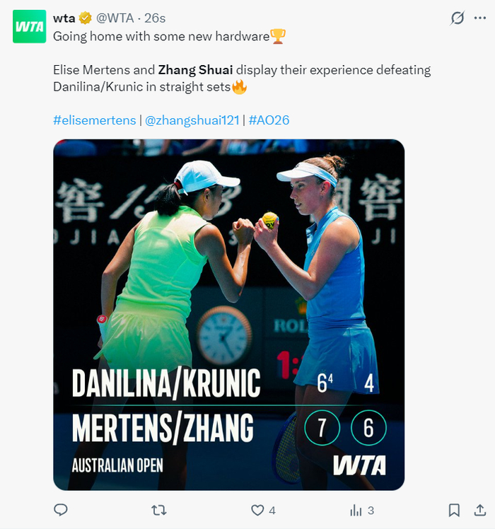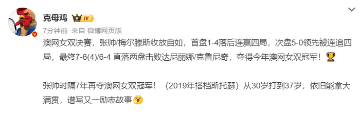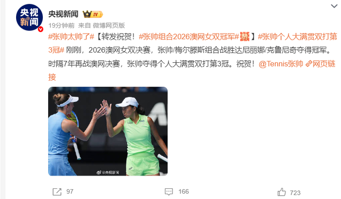 央视新闻也发推祝贺张帅组合2026年澳网女双冠军,这是属于37岁帅姐的时刻。