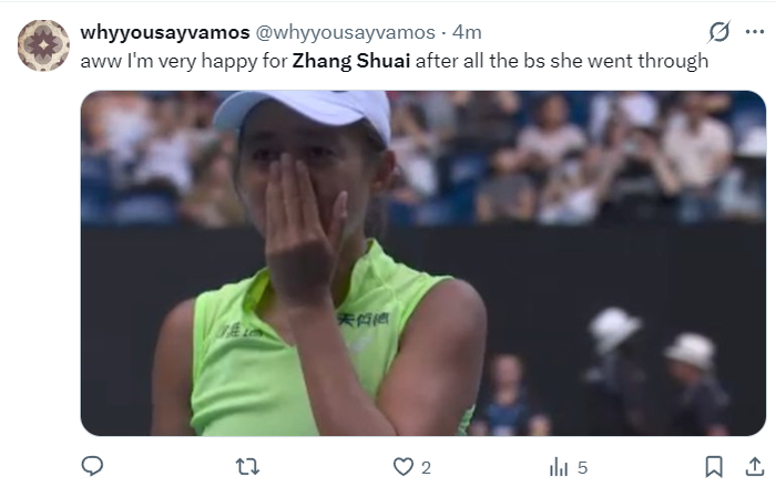 实际上在半决赛赢球后,张帅接受央视访问时她曾这样说道:走到今天与网球相伴32年,在场上,没有一分是蒙的,都是无数次努力换来的。专注当下,做好自己,每一分都值得喝彩。
